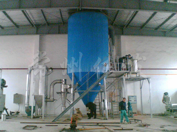 本機是將料液壓入壓力噴嘴霧化成微小霧滴,在塔內與熱風以對流的方式完成干燥,獲得顆粒產品。